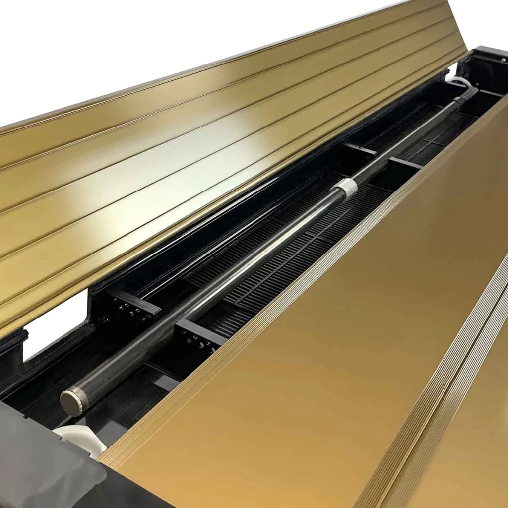 Totalmente desmontable, construida en aluminio de extrusión anodizado industrial de alta resistencia a la corrosión. Dos tapas con bisagras, una frontal y una trasera para facilitar las labores de mantenimiento y alimentación. Diseño moderno y práctico, accesible al sistema de filtración. Dos contactos adicionales para equipamiento accesorio. Interruptor protegido de salpicaduras.